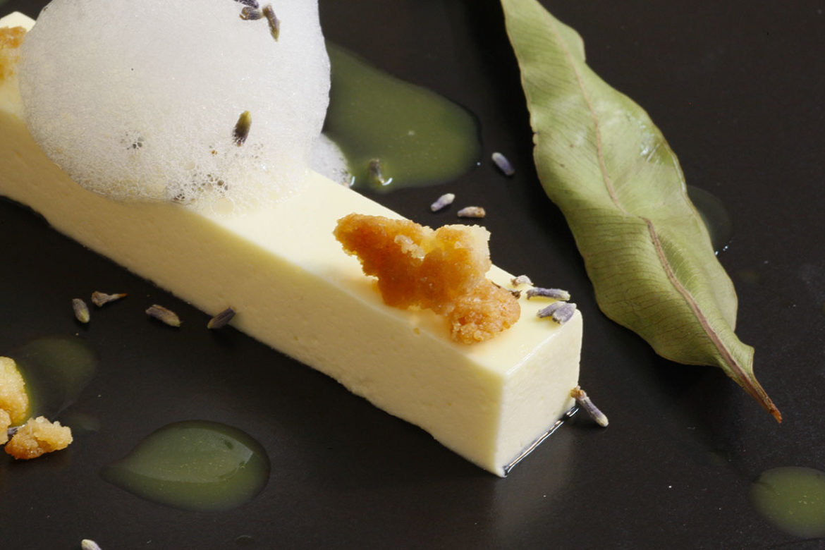J’ai incité Stéphane à recréer de toutes pièces, sous forme d’un dessert, le profil d’un muscat. Plus précisément celui du Muscat de Beaume-de-Venise 2006 de la famille Perrin. Donc, à partir des composés volatils dominants dans le muscat, le géraniol (odeurs de géranium/rose/eucalyptus), le linalol (odeur de lavande/agrumes) et le ho-triénol (odeur de miel), nous avons accouché de ce bavarois de mascarpone quasi parfait et délirant de justesse, où le miel d’orange, le géranium, la lavande, la citronnelle, la menthe et l’eucalyptus viennent tour à tour signer l’identité aromatique des muscats du Midi. Un dessert ludique, pour s’amuser des différentes strates de saveurs juxtaposées, émanant toutes des ingrédients complémentaires aux molécules originelles de cette création au grand pouvoir harmonique. La rencontre harmonique de ce muscat et de l’air de lavande restera longtemps marquée dans notre mémoire olfactive…
