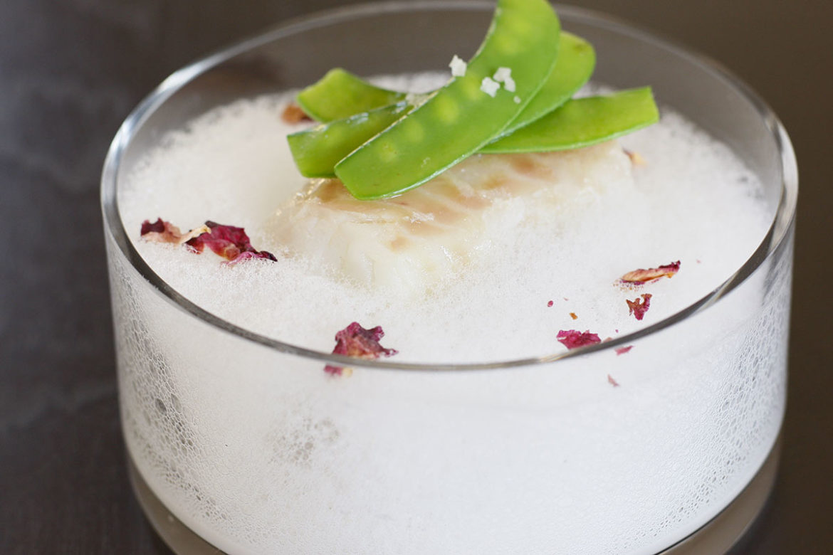 Retirer le poisson du bouillon et le placer dans des assiettes creuses. Remettre le bouillon à chauffer et, à l’aide d’un pied-mélangeur, émulsionner la surface pour produire une mousse homogène. À l’aide d’une cuillère, mettre la mousse autour du morceau de poisson. - Assaisonner les pois mange-tout avec de l’huile d’olive et de la fleur de sel et déposer quelques dés de gingembre confit sur le poisson.