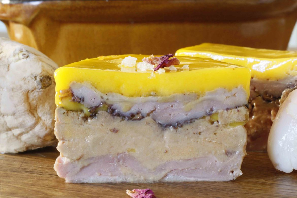 For this recipe, we started off on the rose’s trail, whose dominant aromatic molecule is also present in lychee, ginger and Vidal. The result is a foie gras and quail terrine, which will delight taste buds with an explosion of ginger trapped hitherto under the fluorescent yellow grease on top. The lychee, for its part, remains subtle and discreet, which is rare for this fruit. Finally, don’t hesitate to finely grate ginger (it’s easier to grate when it’s frozen), or frozen mango on each slice, when serving. The aromas of this combination will burst on the palate when you take your first bite!