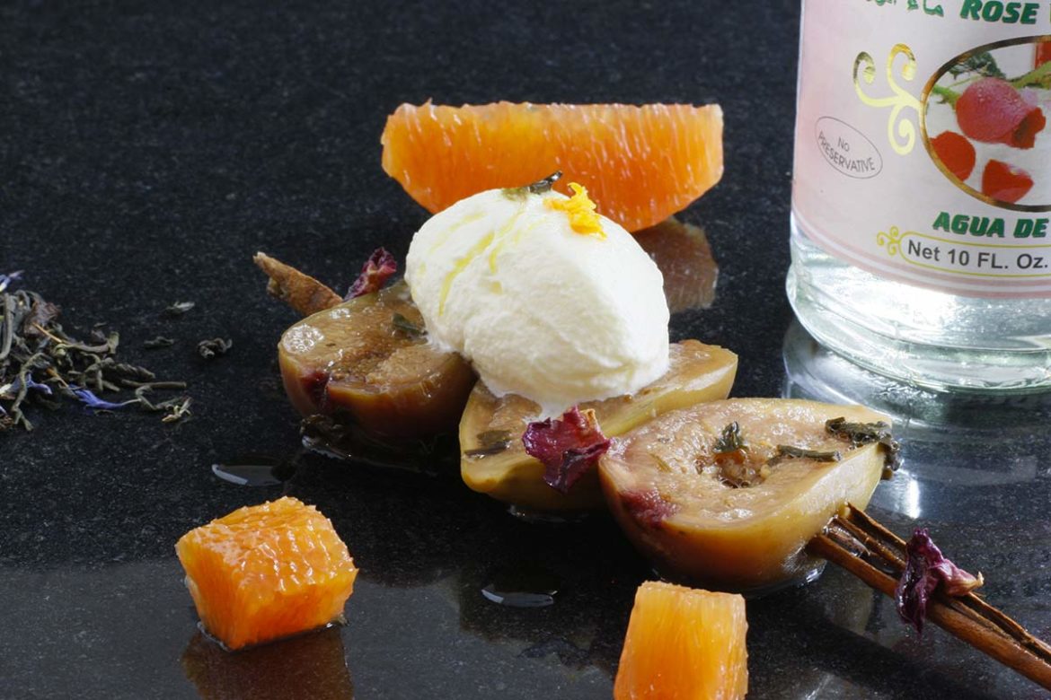 Bergamote, cannelle, eau de rose, figue fraîche et tangerine sont toutes marquées par la piste aromatique du linalol, molécule aux parfums à la fois floraux (lavande/muguet) et fruités (agrumes). Donc, il a été aisé de créer un dessert « linalol », inspiré à la base par cette molécule signant, entre autres, le xérès fino. Le linalol est aussi le principal composé aromatique des agrumes, du basilic doux européen, de la graine de coriandre, de la lavande et de la menthe. Enfin, le linalol, principal terpène du muscat et du riesling, trouve un puissant écho dans la floralité terpénique du safran. Vous avez donc compris que ce sont tous des ingrédients qui auraient pu être envisagés pour cette recette. À vous de choisir!