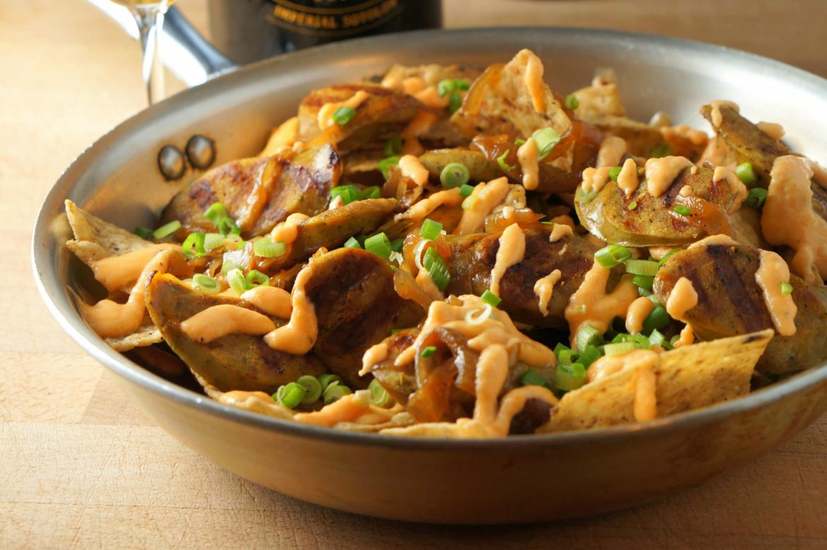 - Étaler les croustilles sur la plaque. Répartir la viande et la sauce au fromage sur les croustilles et terminer avec les oignons verts. Cuire au four de 5 à 7 minutes.