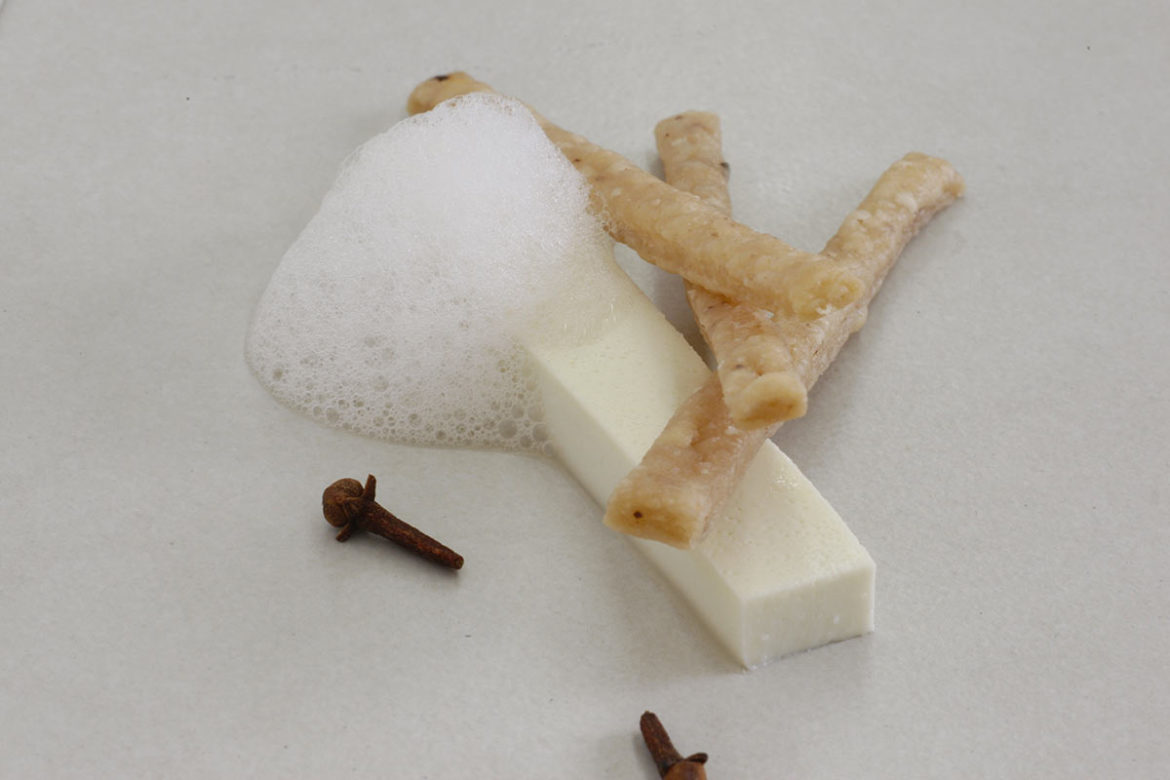 Une inspiration de la contemporaine recette de panna cotta au roquefort (et aux trois fruits en pâte acidulée, insertion de caramel au vieux grenache et élévation aléatoire de bâtonnets à trois saveurs) que Stéphane avait architecturé pour son pharaonique « Menu Architecture », créé alors qu’il était aux commandes du restaurant Utopie, à Québec. Partant de cette conception à base de fromage bleu, nous avons suivi la piste aromatique des aliments complémentaires à ce dernier, dont la rose et le girofle. Vous pourriez aussi opter pour le coing, le curcuma, le galanga, le gingembre, le litchi ou les raisins muscats, qui demeurent dans la même sphère aromatique que les fromages bleus.