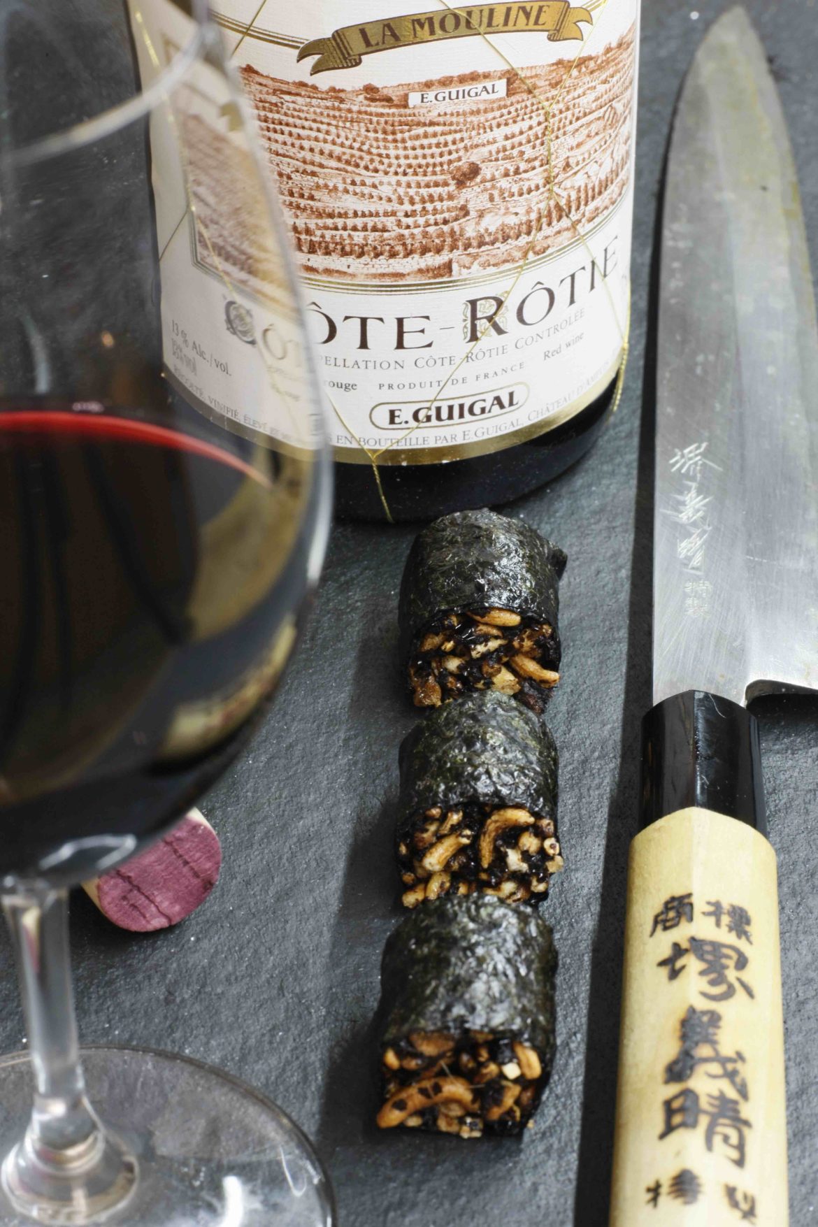 Depuis mon retour de Catalogne, l’idée de travailler le nori me hantait, car, dans la liste des autres ingrédients complémentaires (partageant le même profil moléculaire) à cette algue à sushis, il y a aussi l’olive noire et le poivre. Et qui dit olive noire et poivre dit vin rouge de syrah/shiraz. Idem pour le café, qui, par son effet assouplisseur, a le pouvoir d’arrondir les tanins des vins rouges.